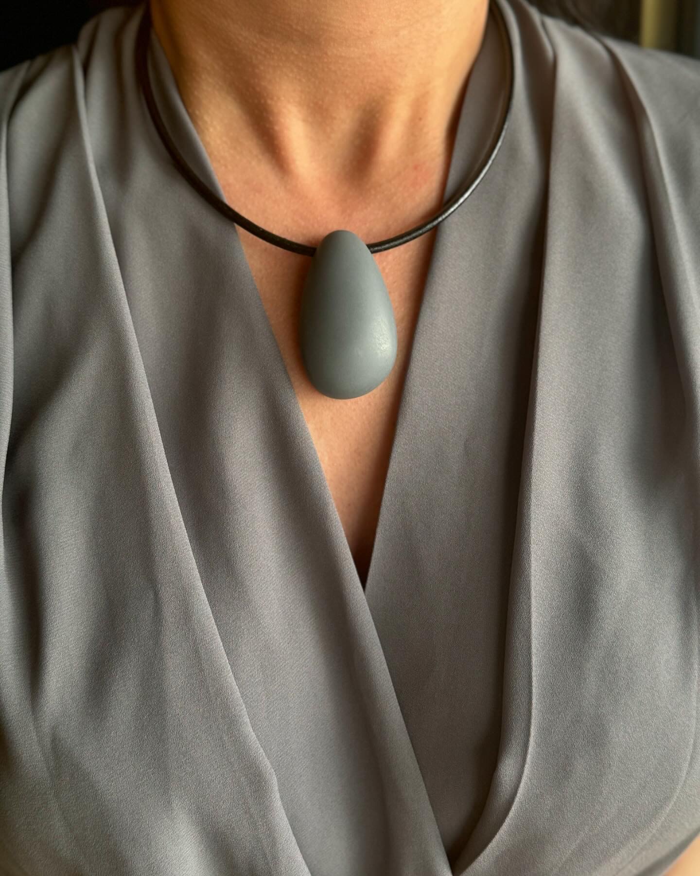 Possui Design Exclusivo. Feito em resina com pingente em formato de gota de resina, o cordão é em couro, fecho e acabamento em resina e couro também